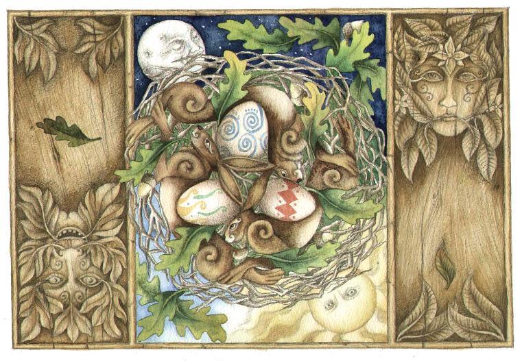 Dort wo wir zu Imbolc noch genau haben hinsehen müssen um das zaghafte und schüchterne neue Leben zu erspähen, spriest und blüht und treibt nun alles in der Natur aus, die Luft ist voller Vogelzwitschern und Summen- die Göttin wandert nun frei als strahlende weiße Jungfrau durch die Welt- Göttin und Gott begegnen sich nun erstmals im Jahresrad wieder als gleichwertige Partner, in gleicher Stärke; sie stehen einander an der Schwelle des Erwachsenenalters gegenüber, umwerben einander, zaghaft zunächst, aber immer intensiver.